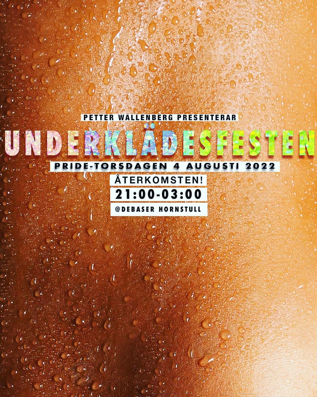 På Pride-torsdagen 31 juli är det äntligen dags för Underklädesfesten – årets mest omtalade, älskade och efterlängtade fest. Ända sedan 2008 har denna legendariska happening samlat alla könsidentiteter, kroppar och åldrar, som slår klackarna i taket iklädda endast underkläderna!